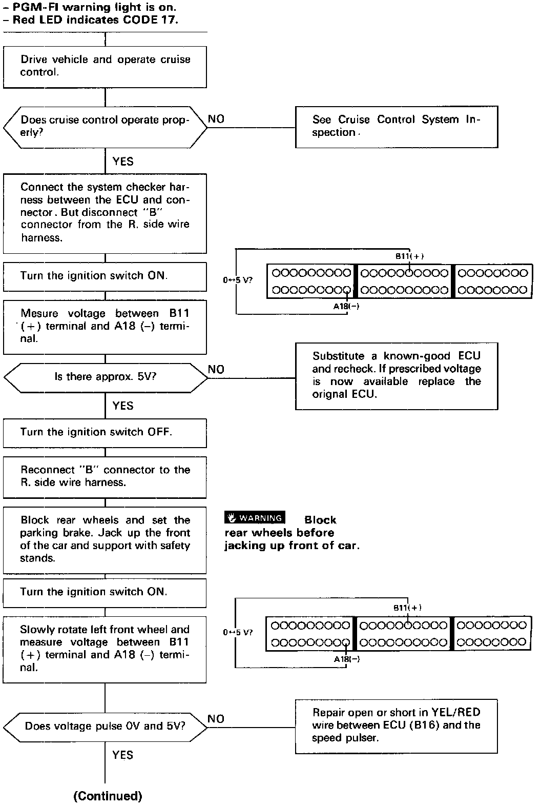 COUPE ONLYSelf-diagnosis Red LED indicator blinks seventeen times: A problem in the Vehicle Speed Pulser circuit.