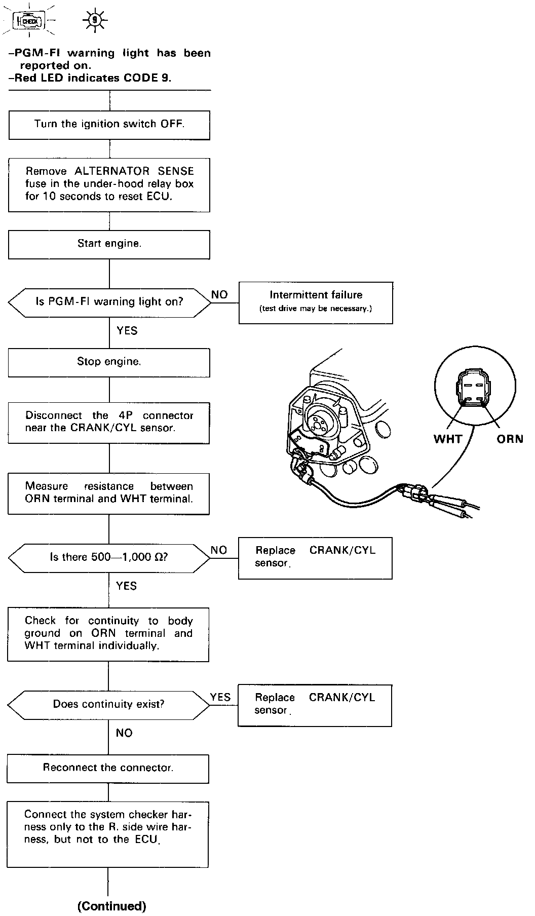 Self-diagnosis Red LED indicator blinks nine times: A problem in the CYL circuit of the CRANK/CYL Sensor.