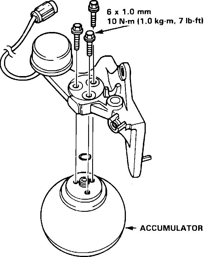 5. Reverse removal procedure to install. When assembling new accumulator to mounting bracket, use new O-ring and torque flange bolts to 7 ft. lbs.