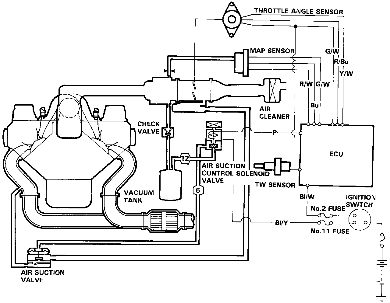 This system is designed to improve emissions performance by supplying fresh air from the air cleaner into the exhaust manifold through the air suction valve.