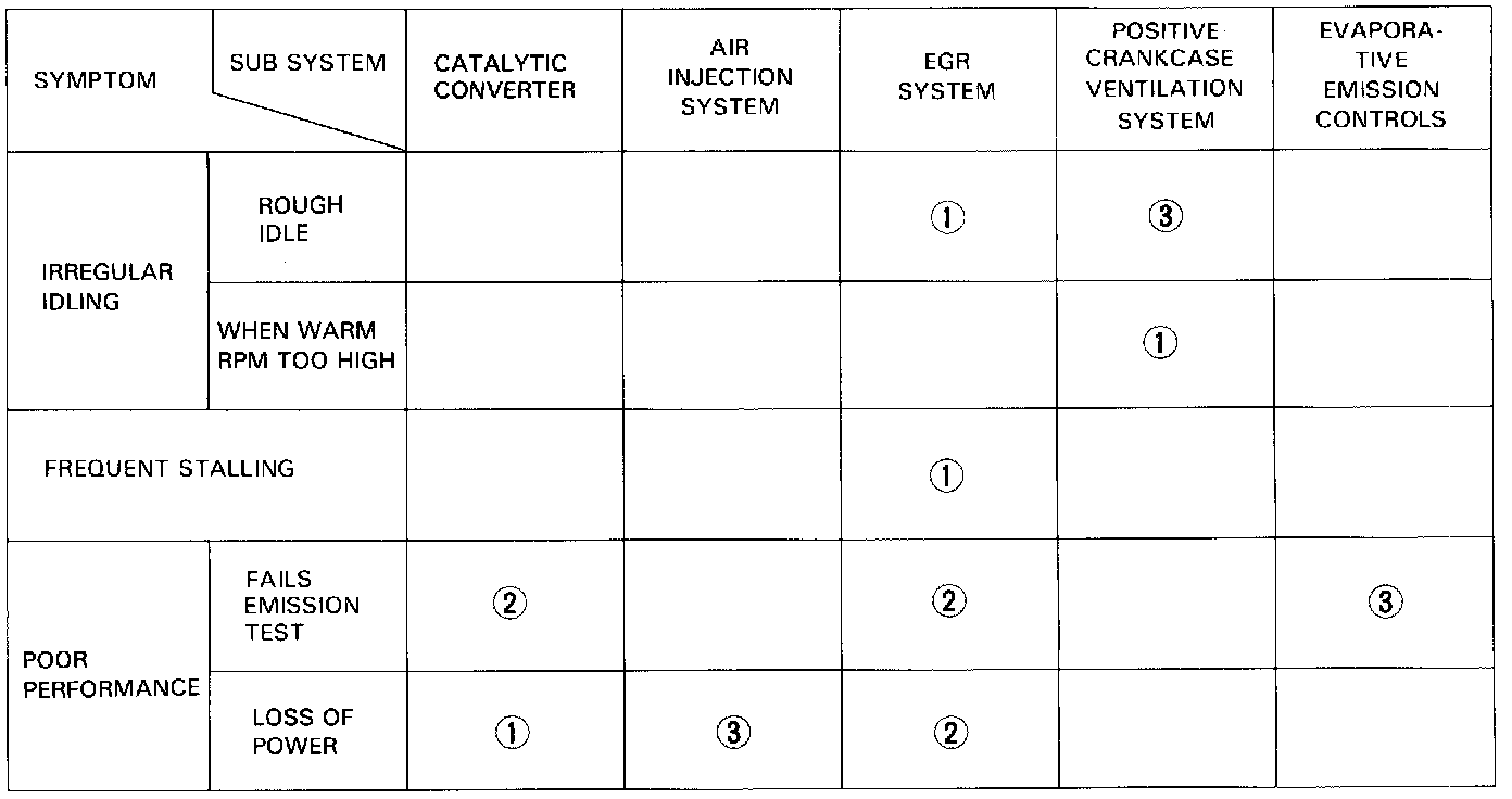 NOTE: Across each row in the chart, the sub systems that could be sources of a symptom are ranked in the order they should be inspected, starting with (1). Find the system in the left column, read across to the most likely source, then refer to the system or component listed at the top of that column. If inspection shows the system is OK, try the next system (2), etc.