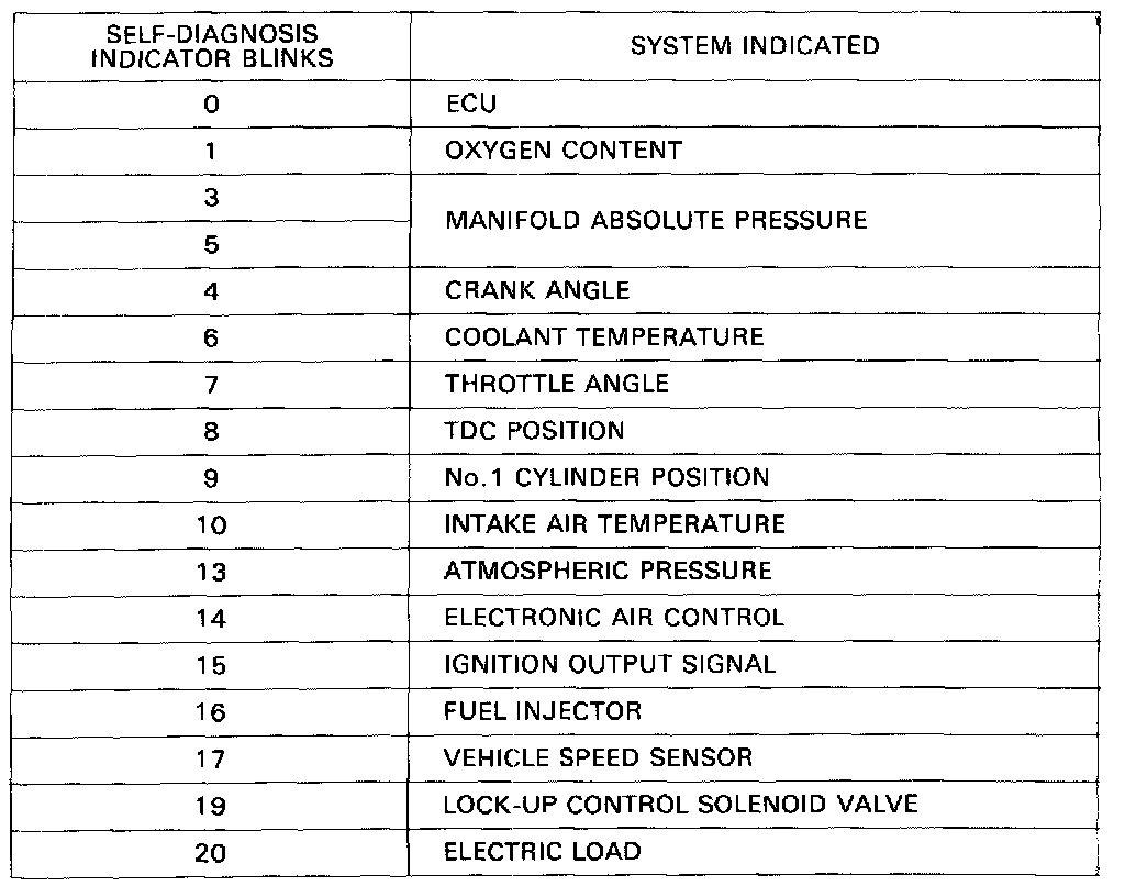 If codes other than those listed above are indicated, count the number of blinks again. If the indicator is in fact blinking these codes, substitute a known-good ECU and recheck. If the indication goes away, replace the original ECU.
