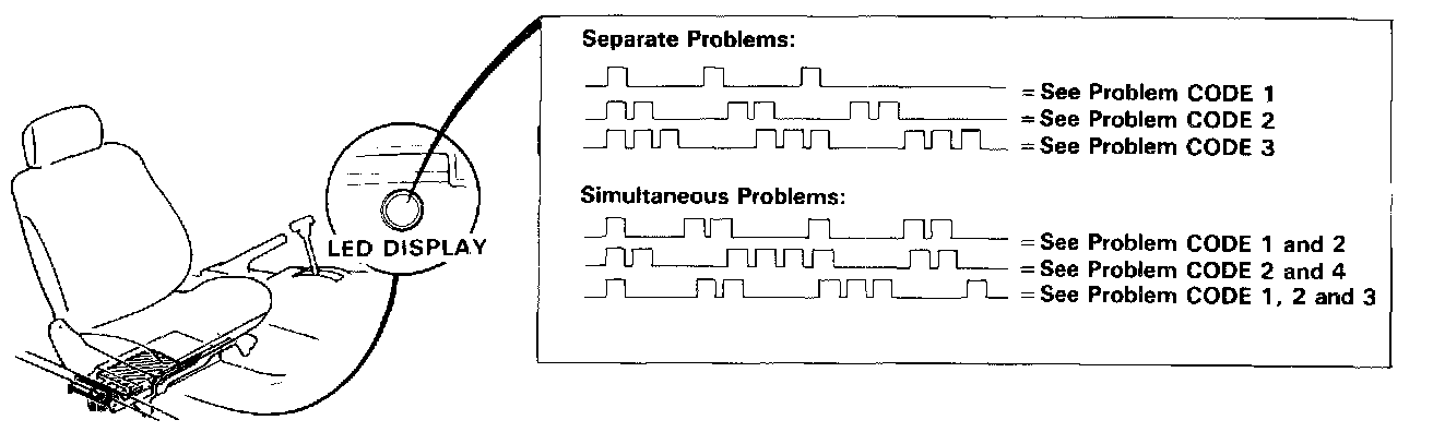 When the Check Engine warning light has been reported on, turn the ignition on, move the front passenger seat to the rear position and observe the LED on the front of the ECU. The LED indicates a system failure code by blinking frequency. The ECU LED can indicate any number of simultaneous component problems by blinking separate codes, one after another.