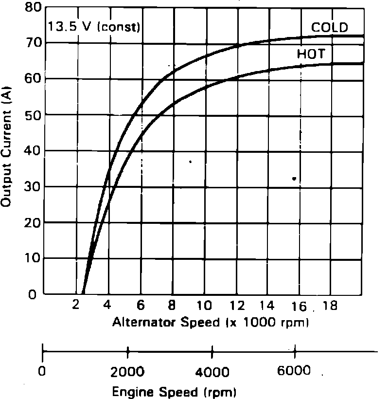 11. Turn on headlights and rear window defogger and ensure cooling fans are off, accelerate and hold engine at 2000 RPM, then apply a load with carbon pile so that voltage drops to no less than 12 volts. Check maximum amperage reading and compare to specifications, Fig. 7. Subtract 5 to 10 amps from reading to allow for engine operation.