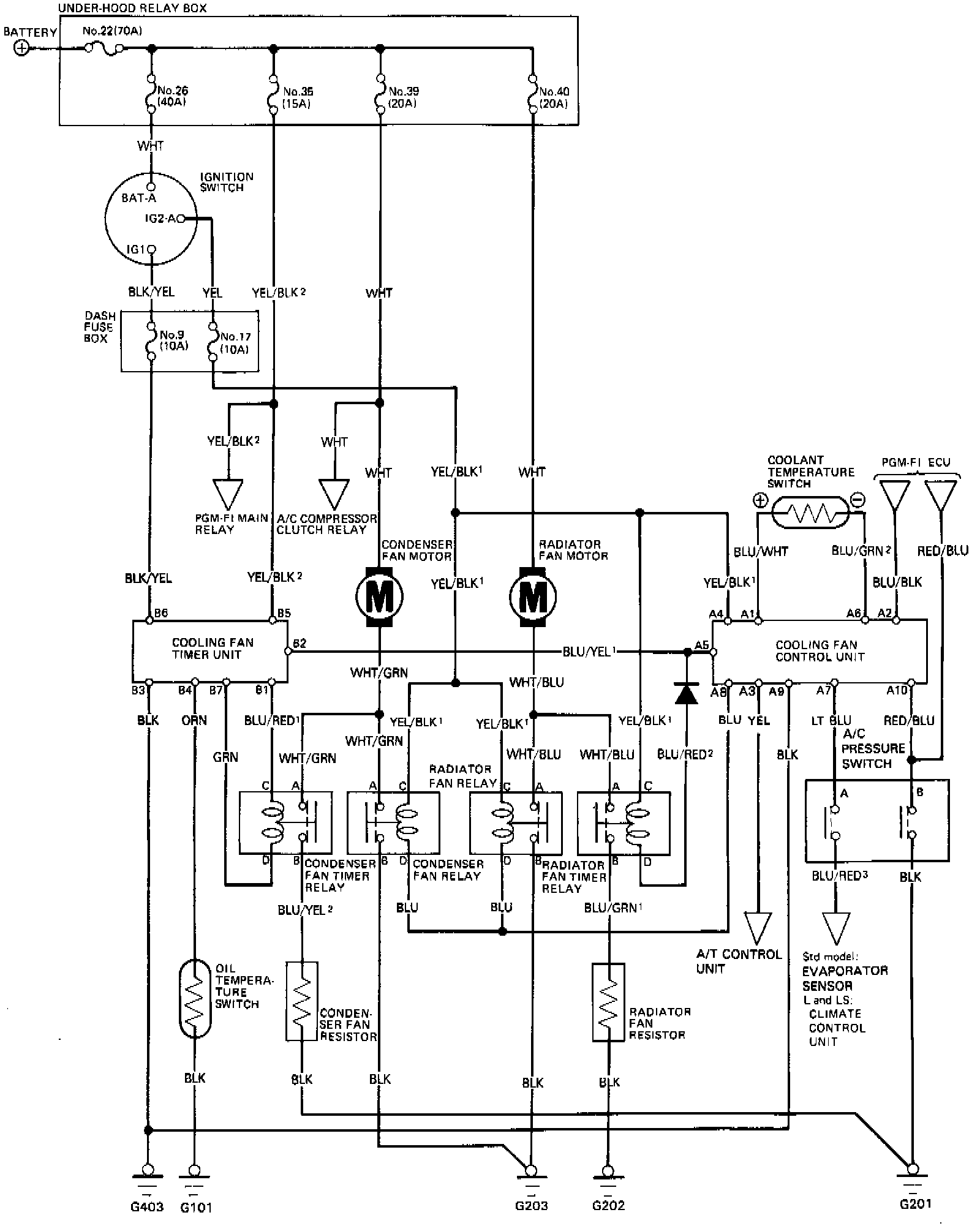 NOTE: Several different wires have the same color. They have been given a number suffix to distinguish them (for example YEL/BLK1 and YEL/BLK2 are not the same).A/C PRESSURE SWITCH