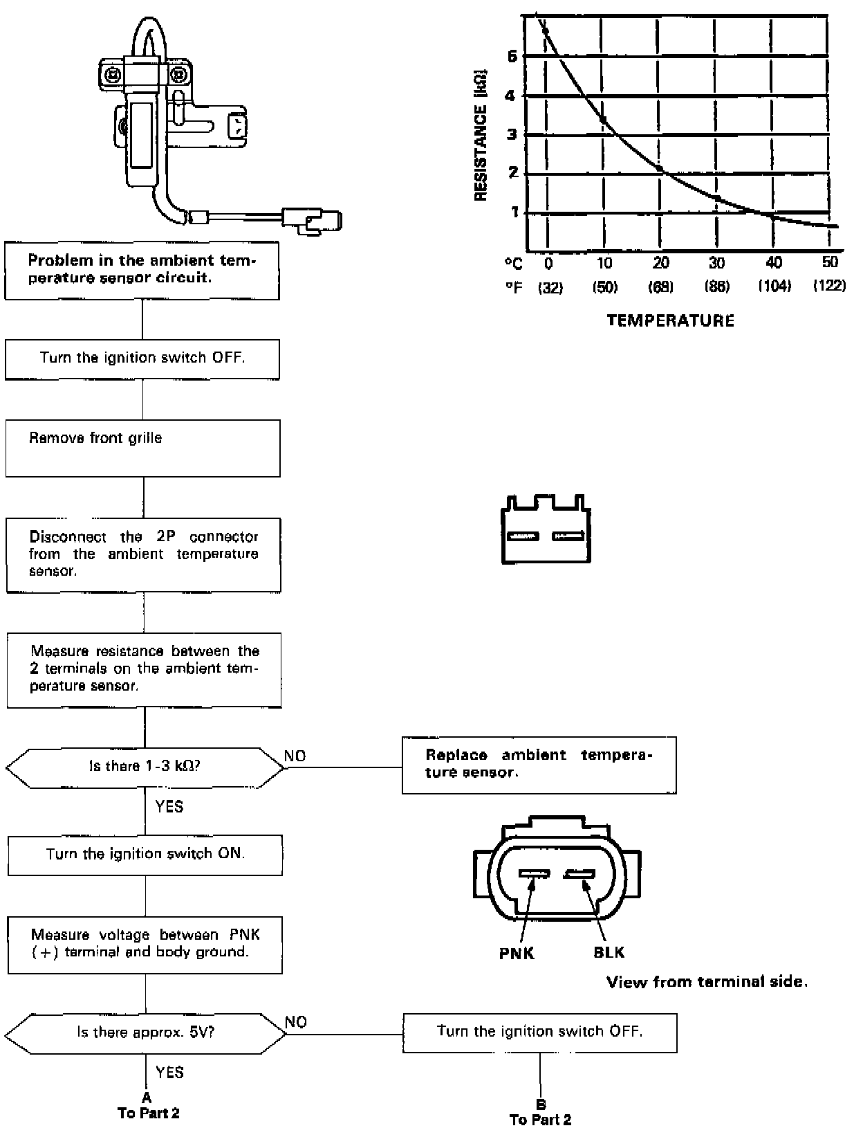 Self-diagnosis indicator light G comes on: Indicates a problem in the Ambient Temperature Sensor Circuit.The ambient temperature sensor is a temperature dependant resistor (thermistor). The resistance of the thermistor decreases as the temperature outside the car increases.