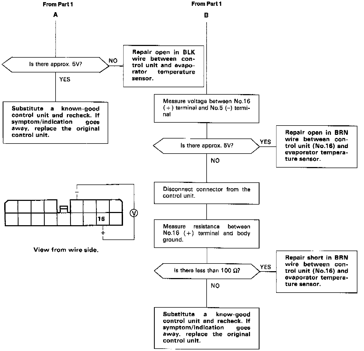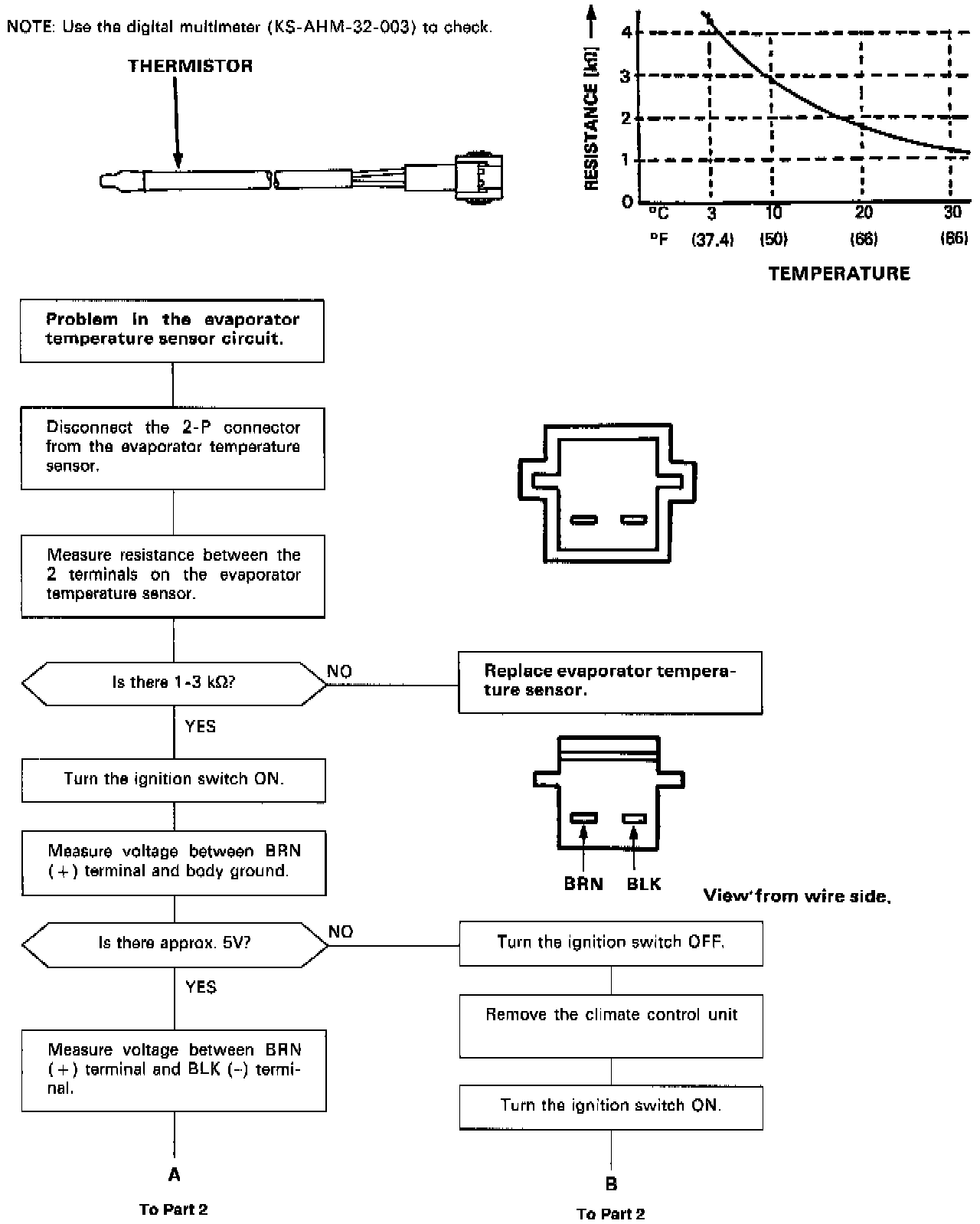 Self-diagnosis indicator light A comes on: Indicates a problem in the Evaporator Sensor circuit.The evaporator temperature sensor is a temperature dependant resistor (thermistor). The resistance of the thermistor decreases as the evaporator outlet air temperature increases, as shown.
