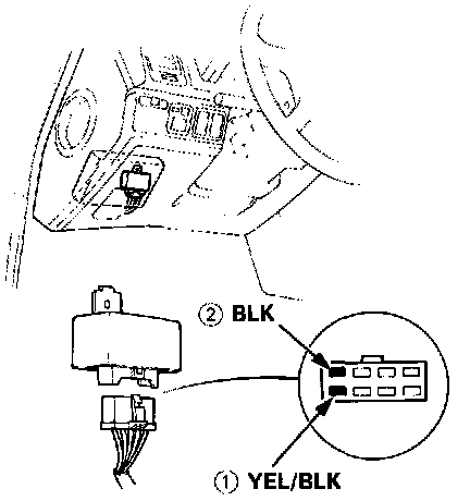 4. Attach the positive probe of voltmeter to the YEL/BLK wire (1) and the negative probe to the BLK wire (2).