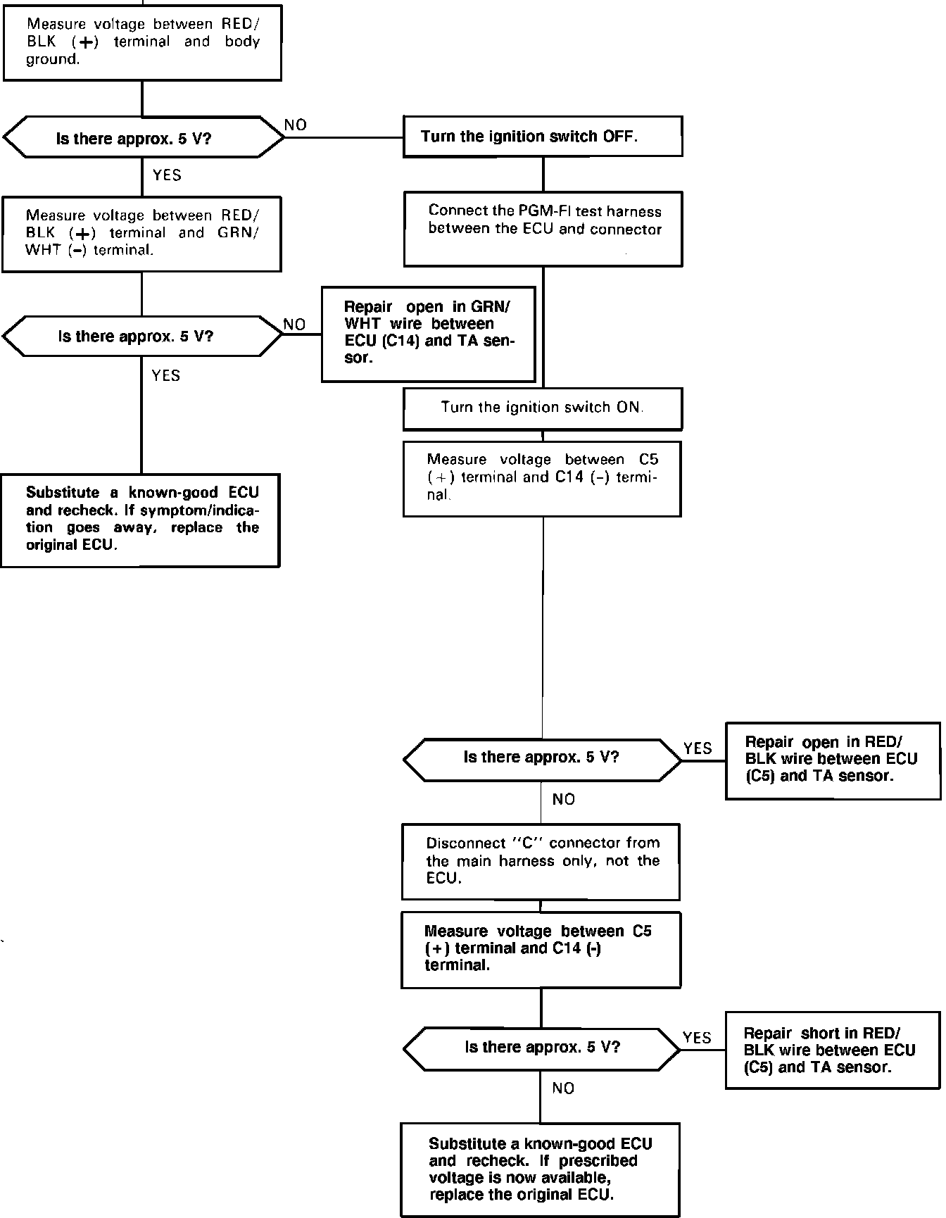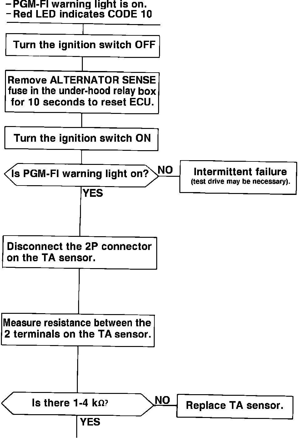 The TA sensor is a temperature dependant resistor (thermistor). The resistance of the thermistor decreases as the intake air temperature increases as shown.