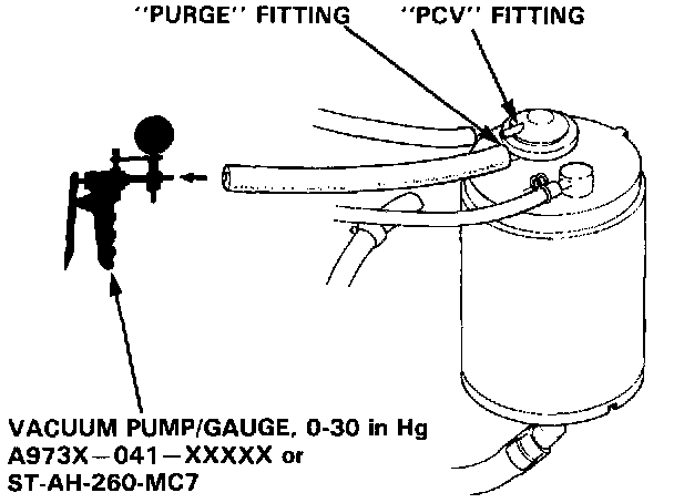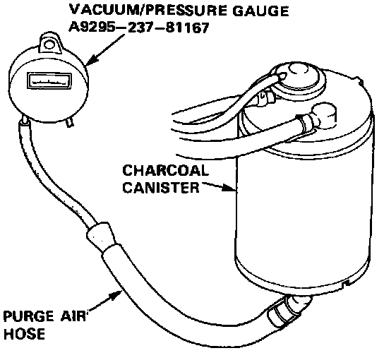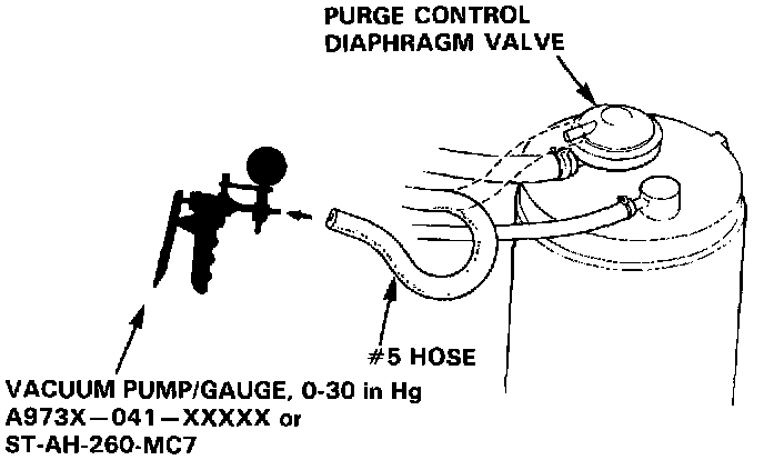 HOT ENGINE1. Disconnect the #5 hose at the purge control diaphragm valve (on the charcoal canister) and connect a vacuum gauge to the hose.