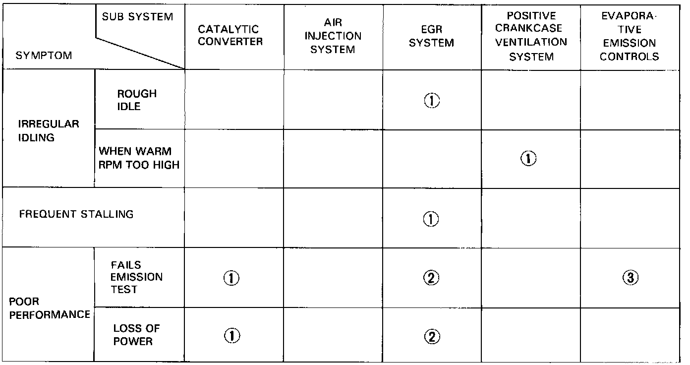 NOTE: Across each row in the chart, the sub systems that could be sources of a symptom are ranked in the order they should be inspected, starting with (1) Find the system in the left column, read across to the most likely source, then refer to the system or component listed at the top of that column. If inspection shows the system is OK, try the next system (2), etc.