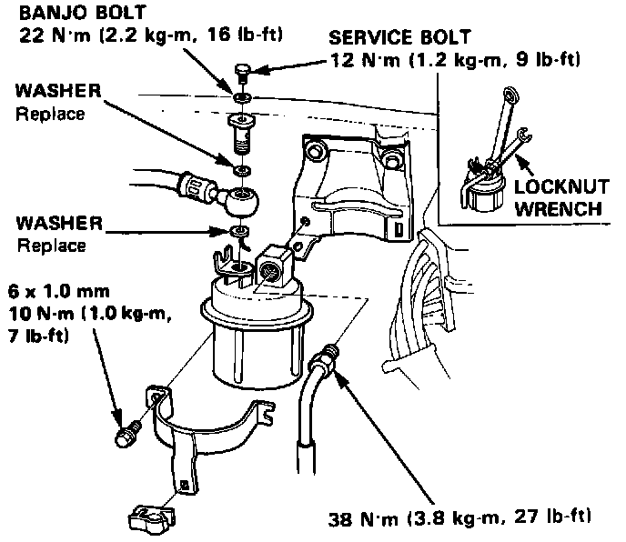 The filter should be replaced: every 4 years or 60,000 miles (96,000 km), whichever comes first or whenever the fuel pressure drops below the specified value (250 - 279 kpa, 2.55 - 2.85 kg/cm2, 36 - 41 psi with the vacuum pressure hose disconnected) after making sure that the fuel pump and the pressure regulator are OK.