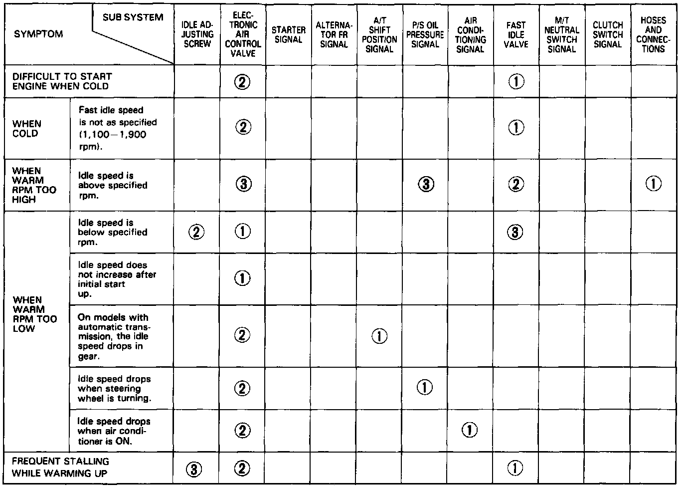 NOTE: Across each row in the chart, the sub-systems that could be sources of a symptom are ranked in the order they should be inspected, starting with (1). Find the symptom in the left column, read across to the most likely source then refer to the system or component listed at the top of that column. If inspection shows the system is OK, try the next system (2), etc.