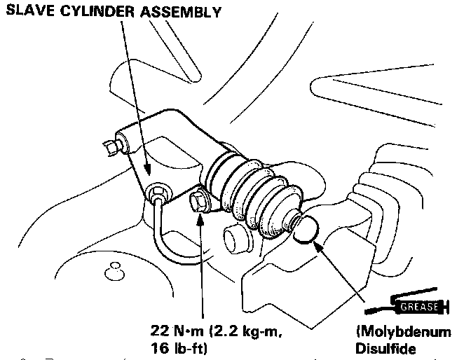 19. Install the clutch slave cylinder with the two 8 x 1.25 mm bolts complete with the pipe and push rod. Torque the bolts to 22 N.m (2.2 kg-m, 16 lb-ft).