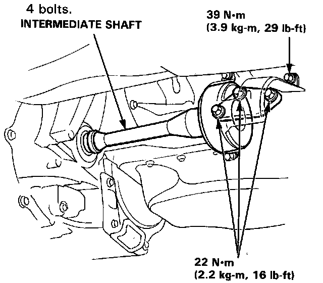 16. Install the intermediate shaft with the three 8 x 1.25 mm bolts and a 10 x 1.25 mm bolt. Tighten 8 mm bolts to 22 N.m (2.2 kg-m, 16 lb-ft) and 10 mm bolt to 39 N.m (3.9 kg-m, 29 lb-ft).