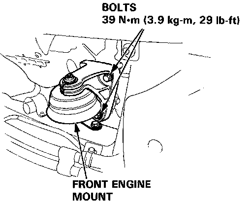 7. Install the front engine mount bolts and torque to 39 N.m (3.9 kg-m, 29 lb-ft).