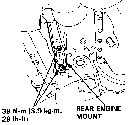 8. Install the rear engine mount bolts and tighten to 39 N.m (3.9 kg-m, 29 lb-ft) torque.