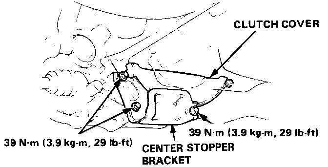 9. Install the center stopper bracket bolts and tighten to 39 N.m (3.9 kg-m, 29 lb-ft).