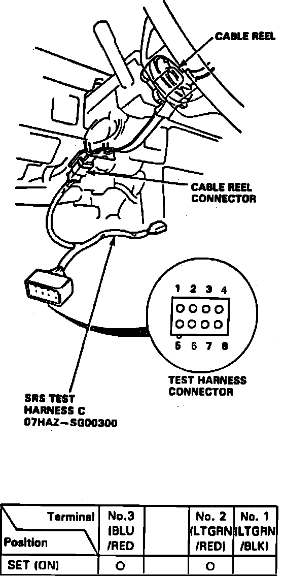4. Remove steering column lower cover and disconnect cable reel connector. Connect SRS test harness C to cable reel connector.