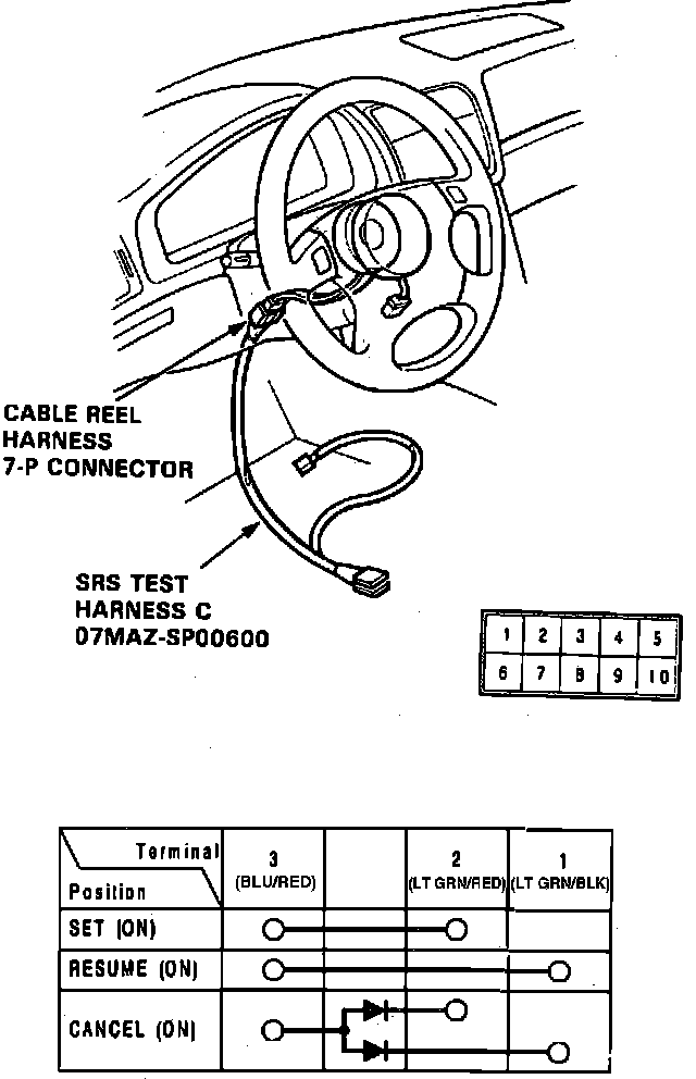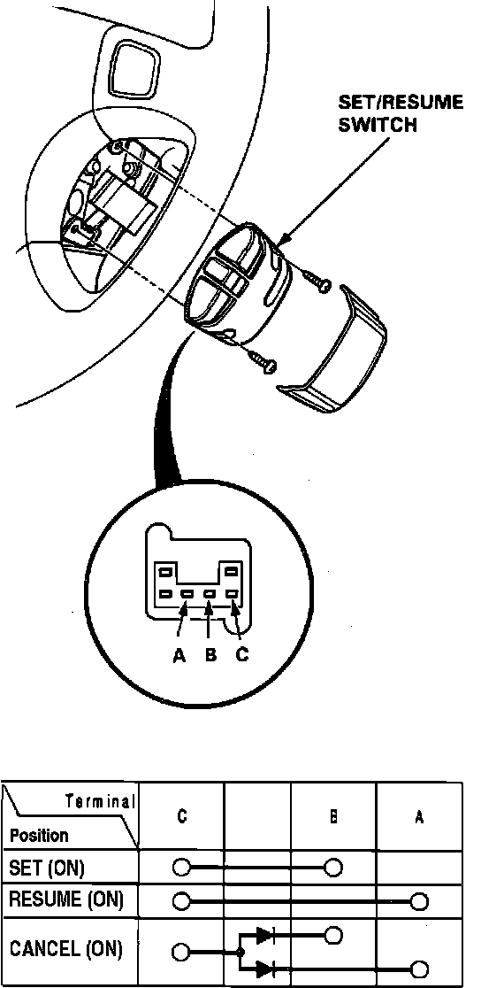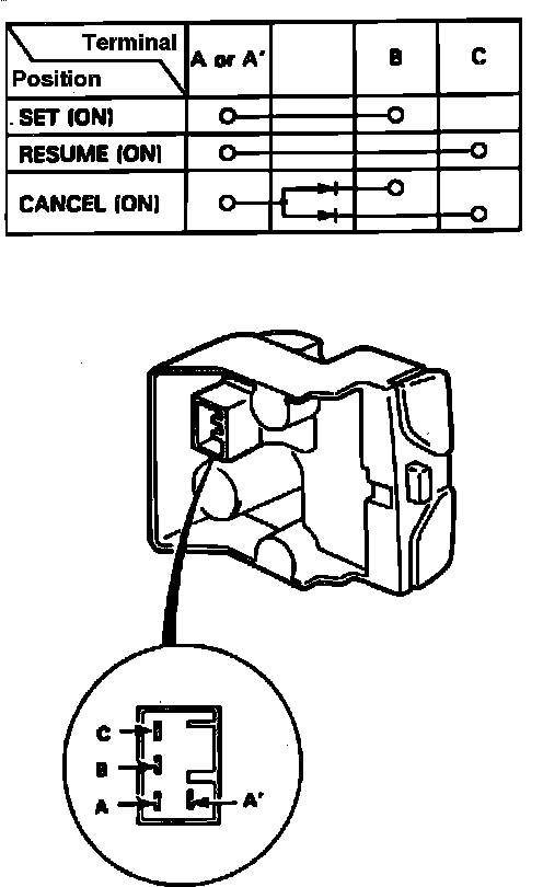 6. If there is continuity in each switch position, set/resume/cancel switch is functional. If there is no continuity in one or some switch positions, replace switch.