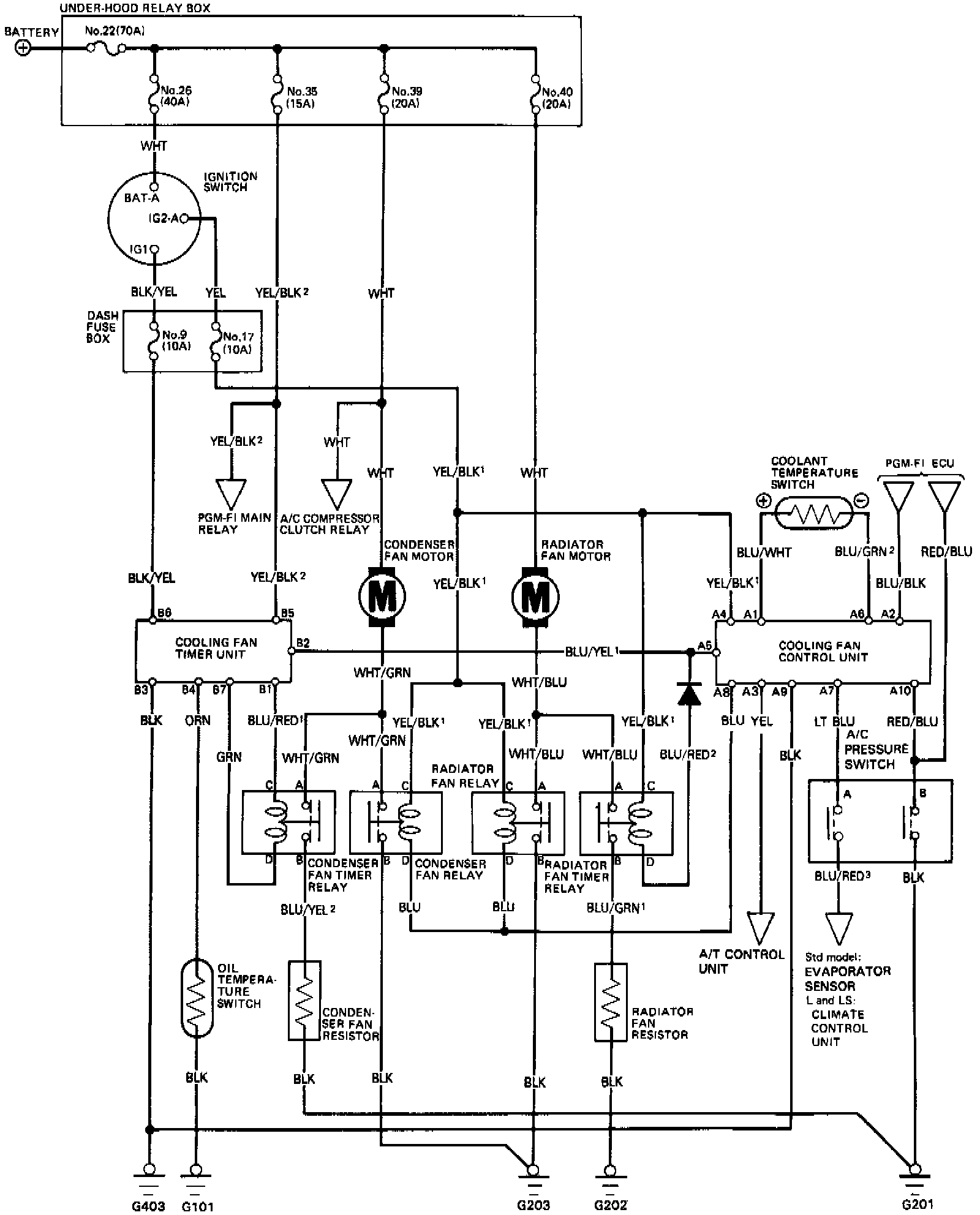 NOTE: Several different wires have the same color. They have been given a number suffix to distinguish them (for example YEL/BLK1 and YEL/BLK2 are not the same).A/C PRESSURE SWITCH
