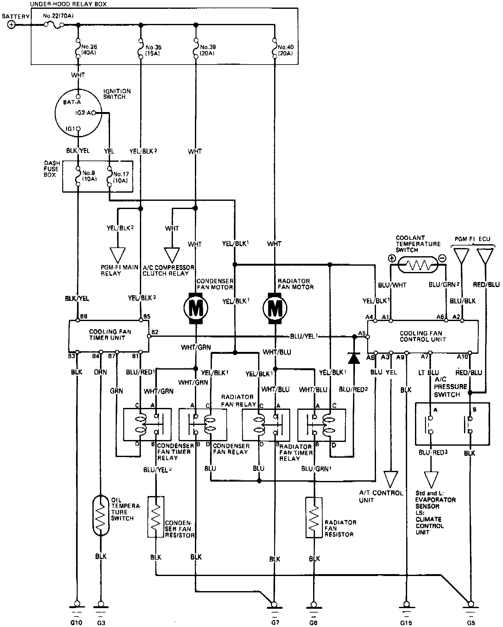 NOTE: Several different wires have the same color. They have been given a number suffix to distinguish them (for example YEL/BLK1 and YEL/BLK2 are not the same).A/C PRESSURE SWITCH