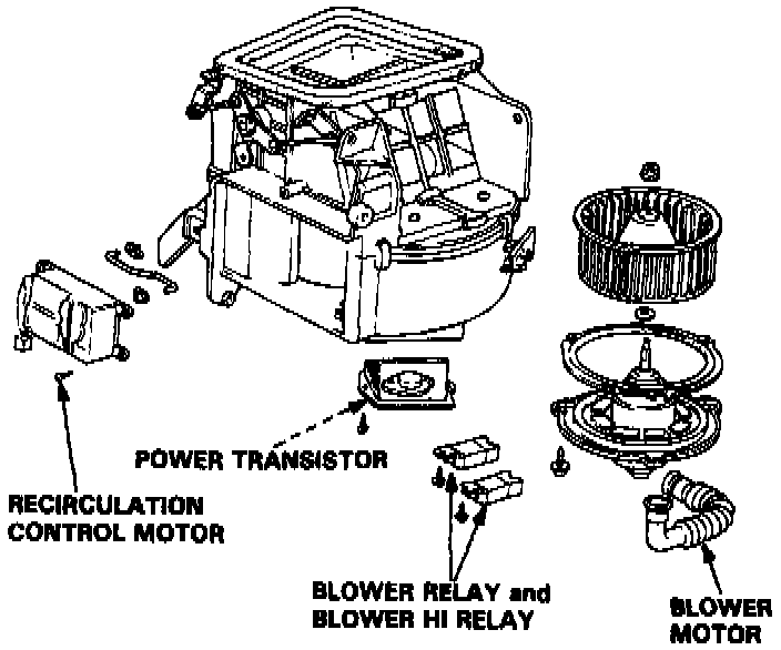 The Blower Relay and Blower Hi Relay are located on the underside of the Blower Assembly, which is located under the dash on the passenger's side.