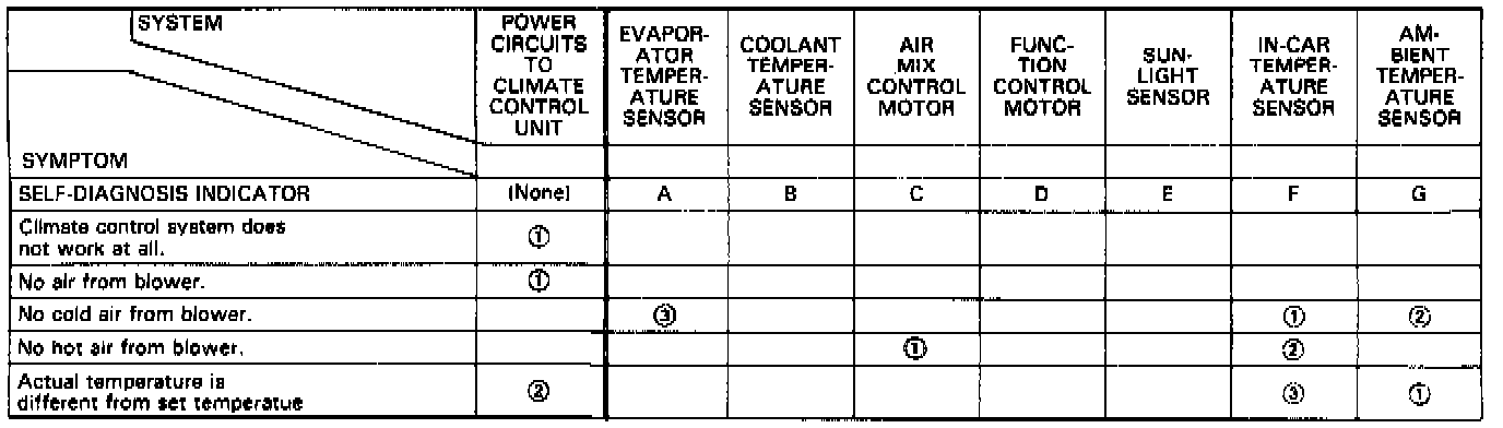 NOTE: If you have one of the above symptoms, but no self-diagnosis indicator light, one of the basic heater/air conditioner components controlled by the system could be the cause, i.e., blower motor, A/C compressor clutch, recirculation control motor, etc. Refer to Manual Heating and Air Conditioning for troubleshooting and testing.
