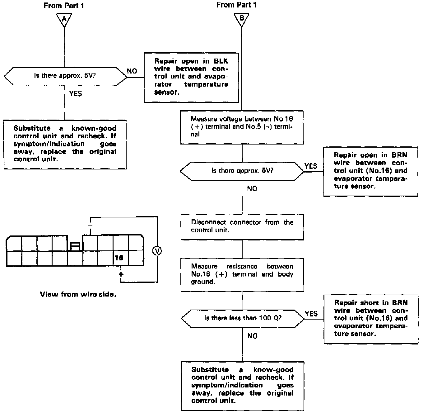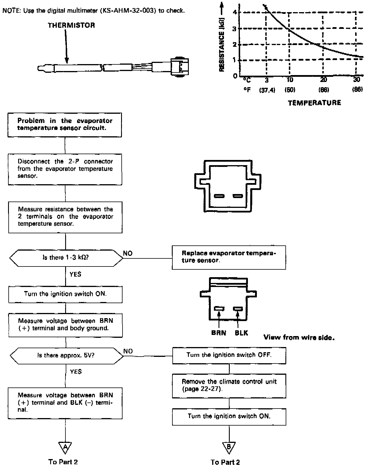 Self-diagnosis indicator light A comes on: Indicates a problem in the Evaporator Sensor Circuit.The evaporator temperature sensor is a temperature dependant resistor (thermistor). The resistance of the thermistor decreases as the evaporator outlet air temperature increases, as shown below.