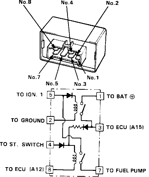 The first relay is energized when the ignition is turned ON and supplies current to the ECU, the injectors, and the second relay.