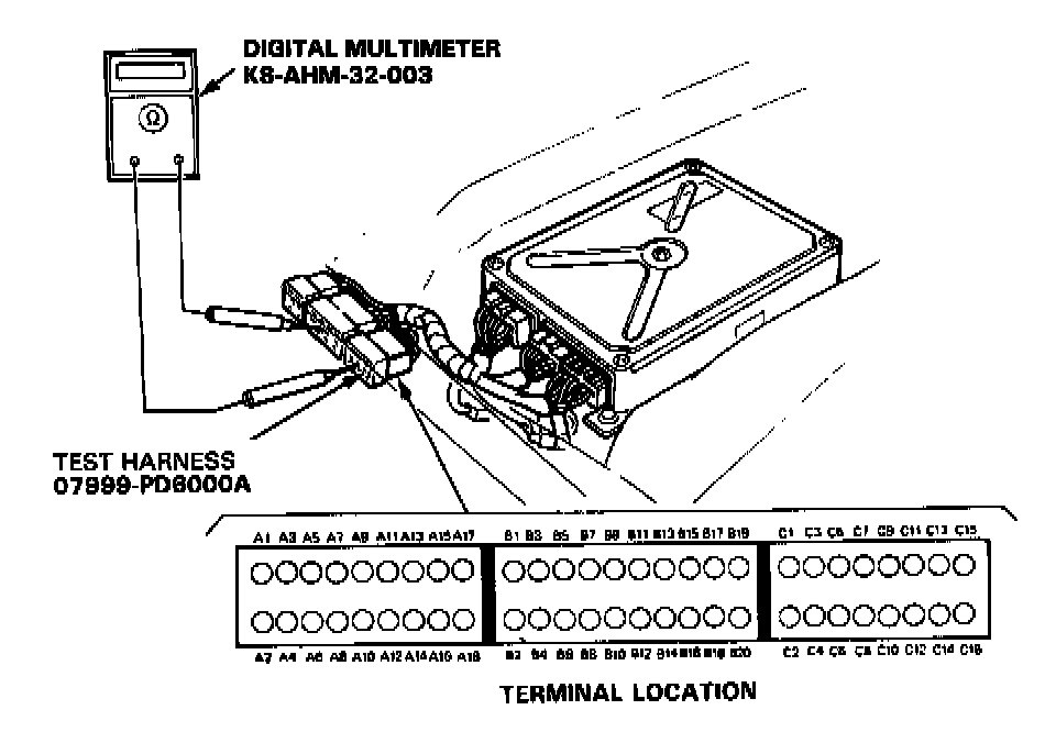 If the inspection for a particular failure code requires the PGM-FI test harness, remove the front passenger seat and connect the PGM-FI test harness and multimeter as shown. Then check the system according to the procedure described for the appropriate code(s).