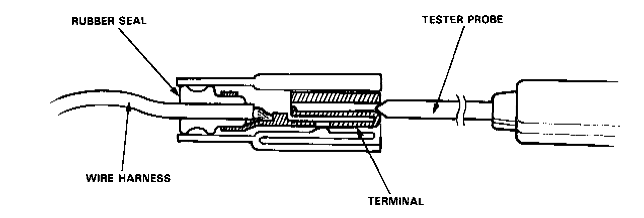 - For testing at connectors other than the system checker harness, bring the tester probe into contact with the terminal from the connector side of wire harness connectors in the engine compartment. For female connectors, just touch lightly with the tester probe and do not insert the probe.