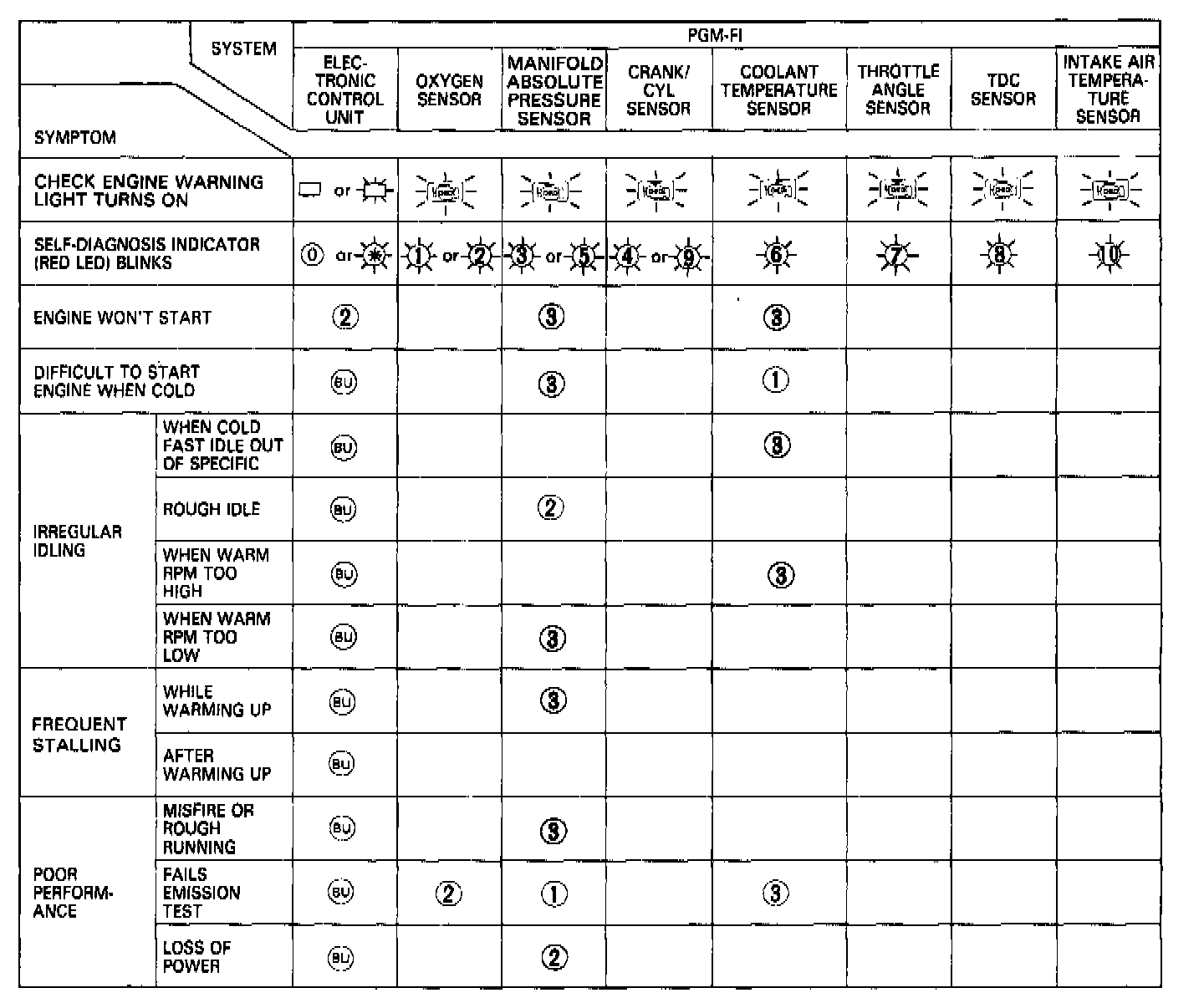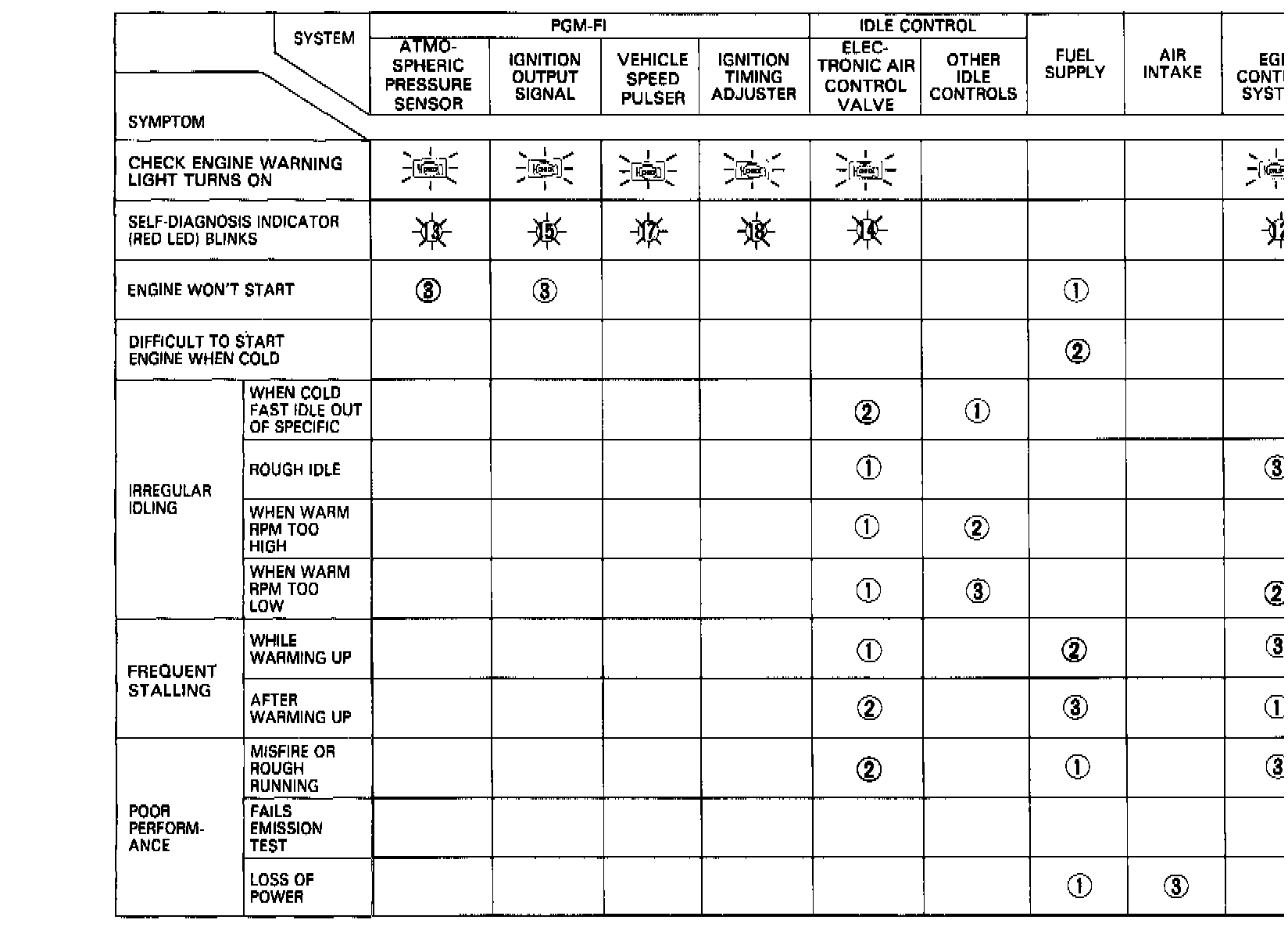 NOTE: Across each row in the chart, the systems that could be sources of a symptom are ranked in the order they should be inspected starting with (1). Find the symptom in the left column, read across to the most likely source, then refer to the component listed at the top of that column. If inspection shows the system is OK, try the next most likely system, etc.Part 1 Of 2: