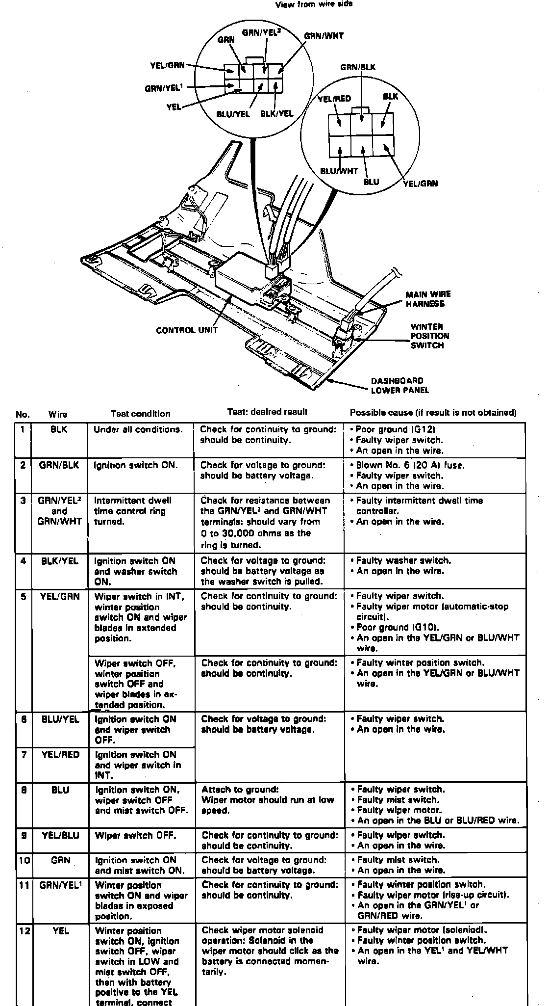 7. With wiper switch in INT, winter position switch On and wiper blades extended in position, check for continuity between yellow/green to ground, continuity should be indicated, if not, faulty wiper switch, wiper motor, poor ground or an open in yellow/green or blue/white wire is indicated.