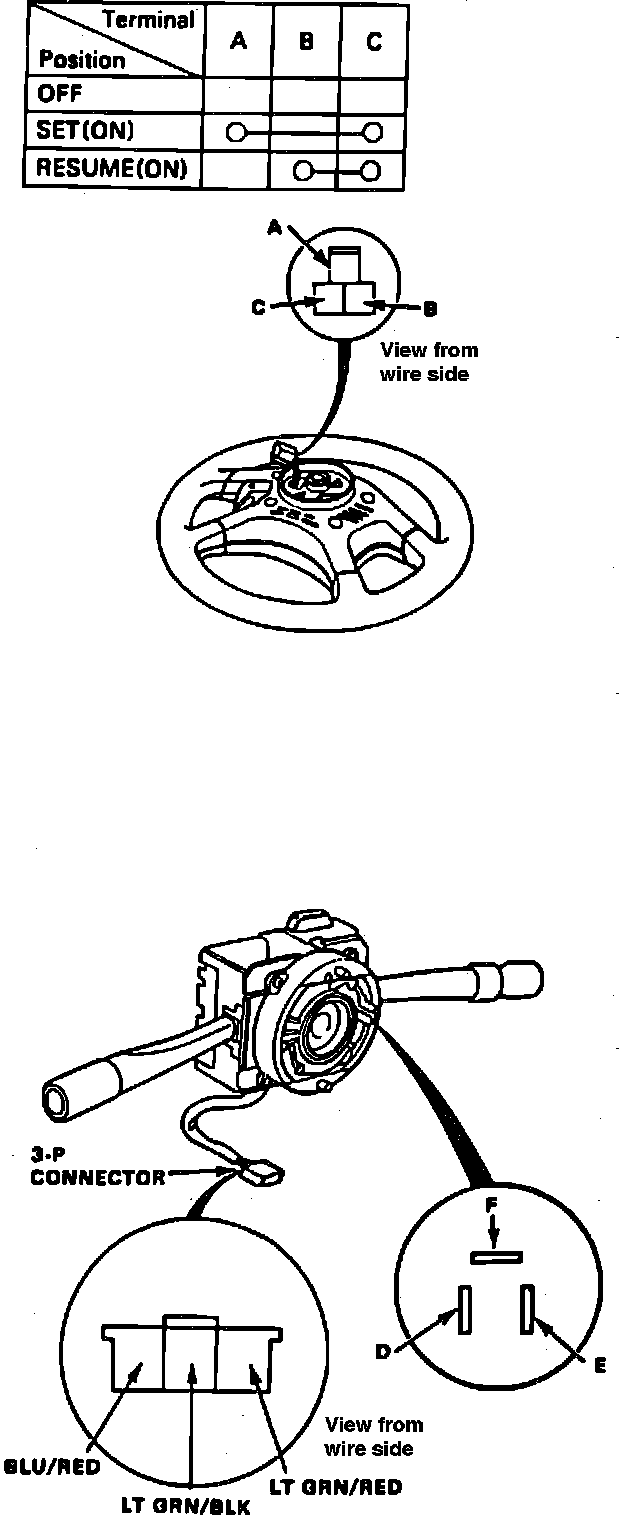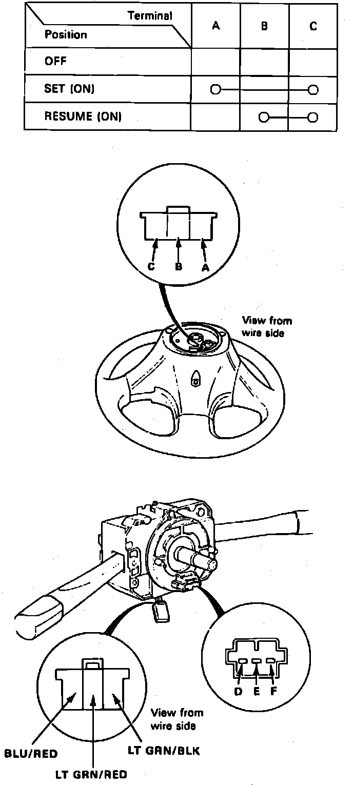 3. On 1989 models, while turning slip ring, check for continuity between the blue/red and F terminal, light green/red and D terminal, and light green/black and E terminal.
