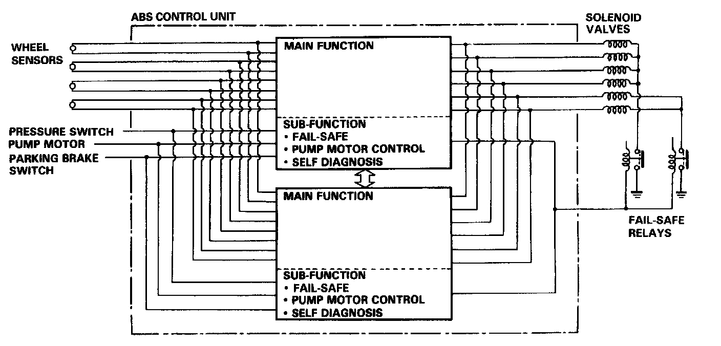 The ABS control unit consists of a main function section, which controls the operation of anti-lock brake system, and sub- function, which controls the pump motor and "self-diagnosis."