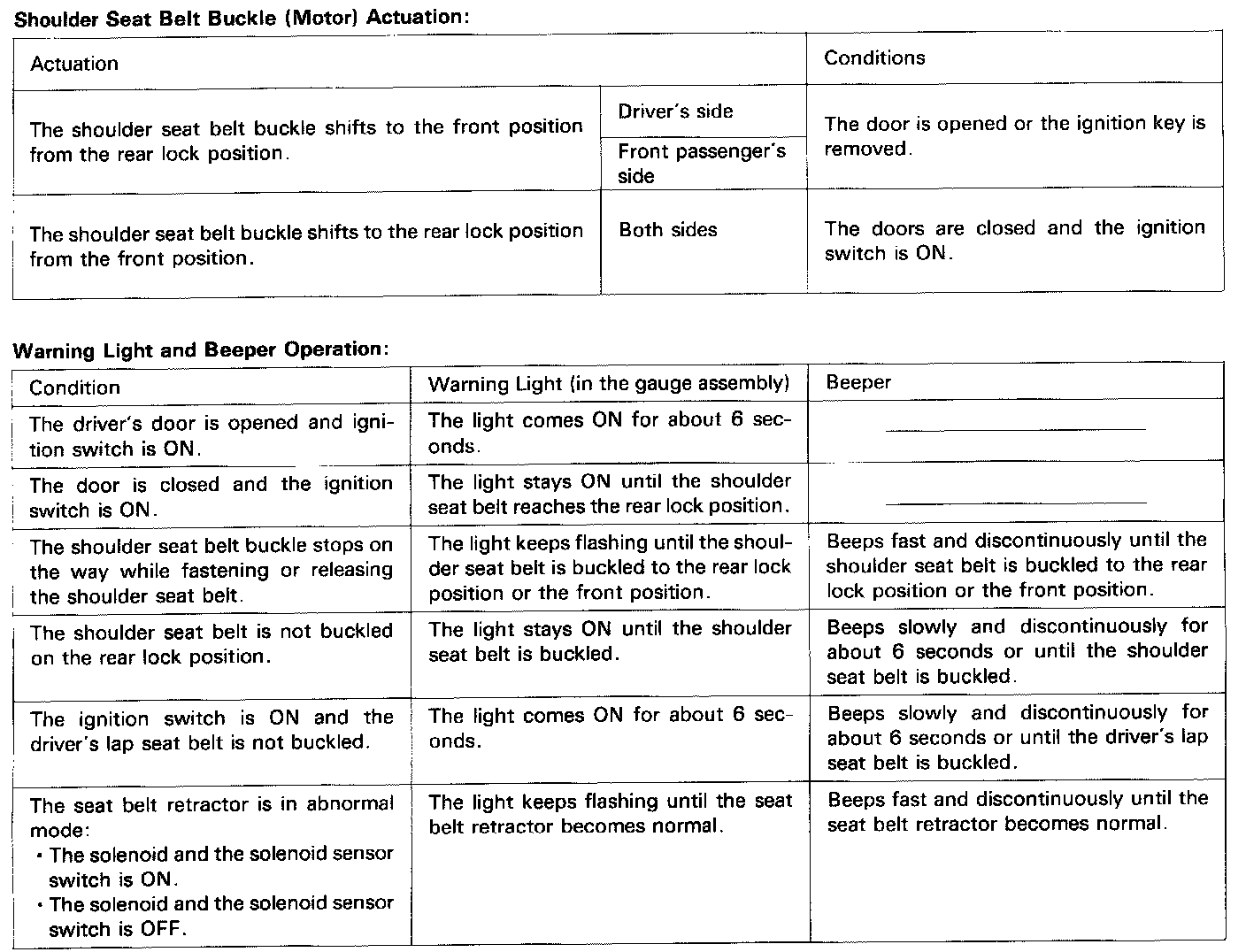 When a door is opened or the shoulder buckle motor is operating, a solenoid in each shoulder seat belt retractor is energized, disabling the shoulder seat belt retractors and permitting free movement of the shoulder seat belt. In the same way, when the ignition switch is OFF, the shoulder seat belt retractor is unlocked for 3 minutes after the door is closed.