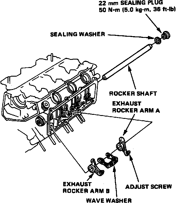 c. Fully insert rocker shaft, then install sealing plug and torque to 36 ft. lbs. (33 ft. lbs on 2.7L engine).