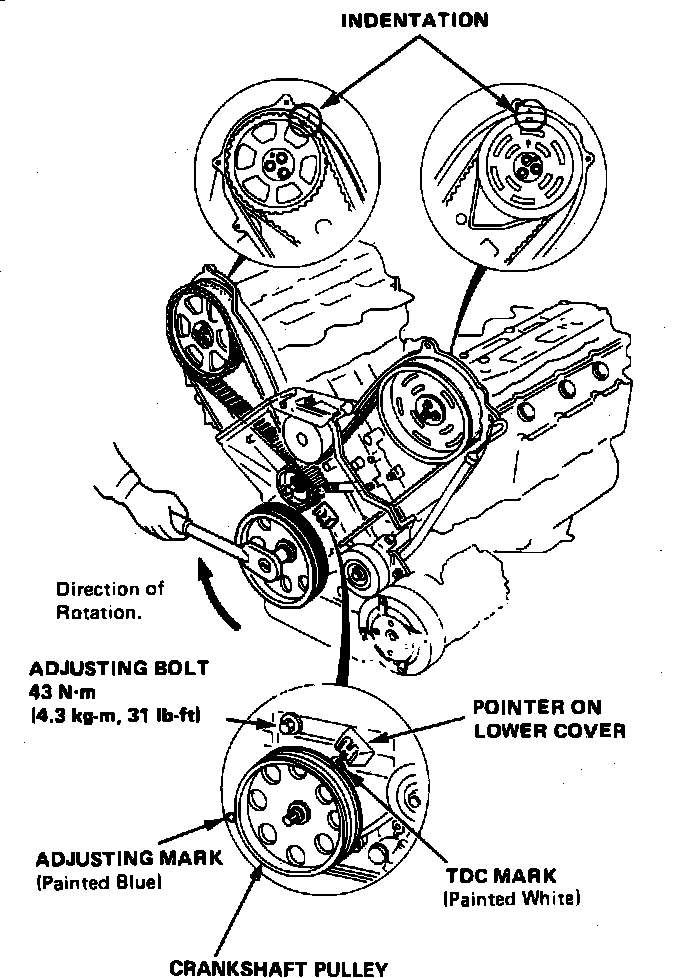 26. Remove timing belt upper covers, then loosen tension bolt and remove timing belt. Advance crankshaft approximately 15° prior to removing timing belt to prevent interference between valve and piston. Do not bend or crimp timing belt more than 90° or to less than 1 inch in diameter.