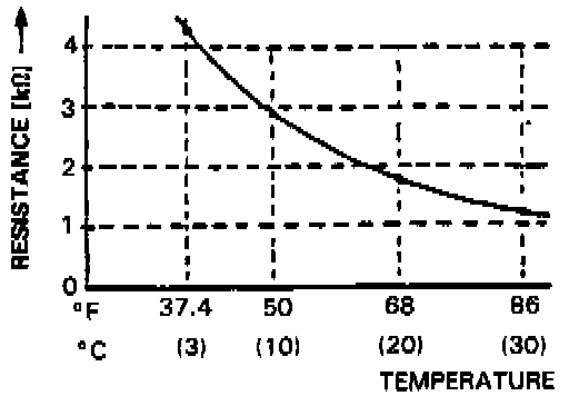 The resistance reading between terminals of the evaporator temperature sensor should match the specification shown in the graph.