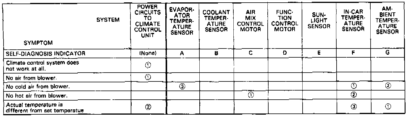 NOTE: If you have one of the above symptoms, but no self-diagnosis indicator light, one of the basic heater/air conditioner components controlled by the system could be the cause, i.e., blower motor, A/C compressor clutch, recirculation control motor, etc. Refer to the Manual Heating and Air Conditioning for troubleshooting and testing.