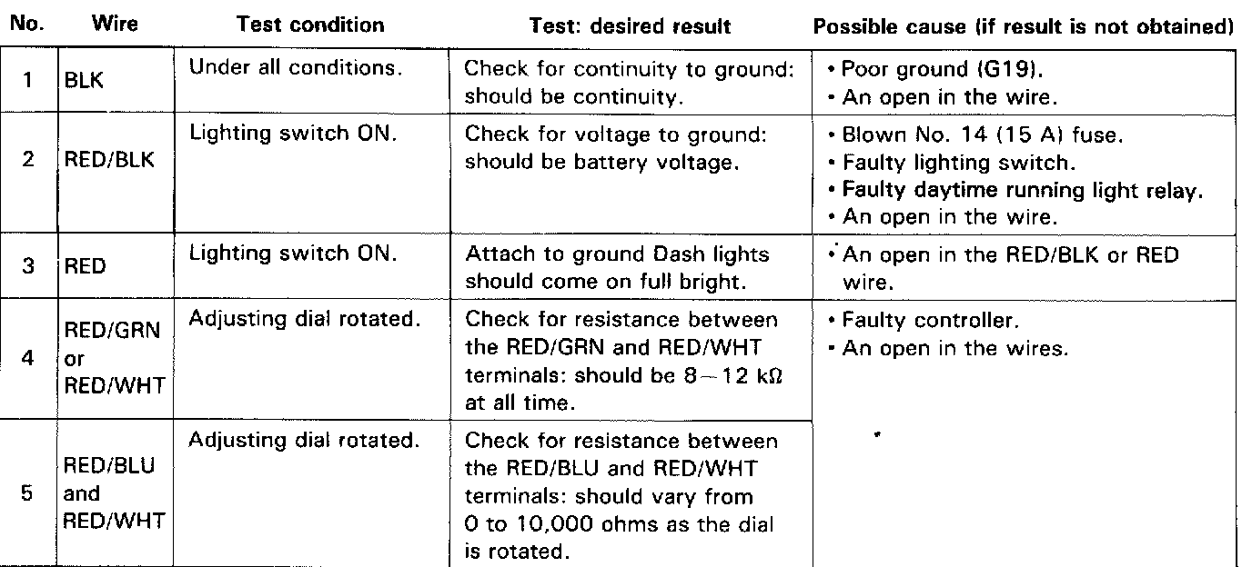 Make the following input tests at the harness pins. If all tests prove OK, yet the dash lights still cannot be controlled, check the connector for a good connection. If OK, substitute a known-good control unit and recheck.
