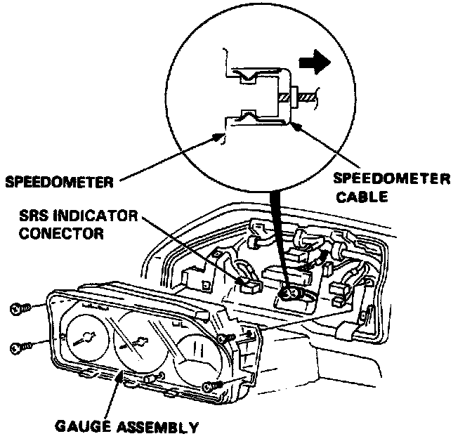 2. Remove the 4 screws, then pull the gauge assembly out half-way and disconnect the speedometer cable and connectors.