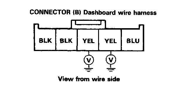Connect a voltmeter between body ground and each of the YEL terminals (separately) of the 5-P connector located on the rear of the meter. Is battery voltage available at each YEL terminal with ignition switch ON?