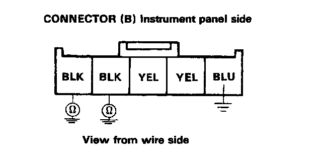 5. Check for continuity between the body ground and BLK terminals (separately) of the 5-P connector located on the rear of the meter.