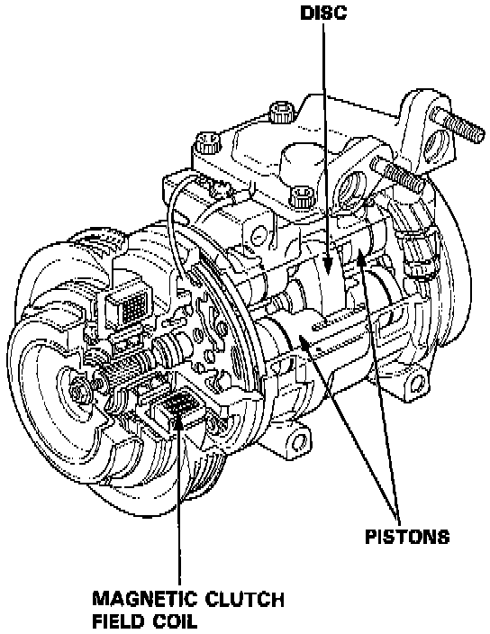 The compressor is a Nippondenso piston type. A revolving inclined disc drives the surrounding 10 reciprocating pistons. As the inclined disc revolves, it pushes the pistons, protected by a ceramic shoe, thus compressing the refrigerant.