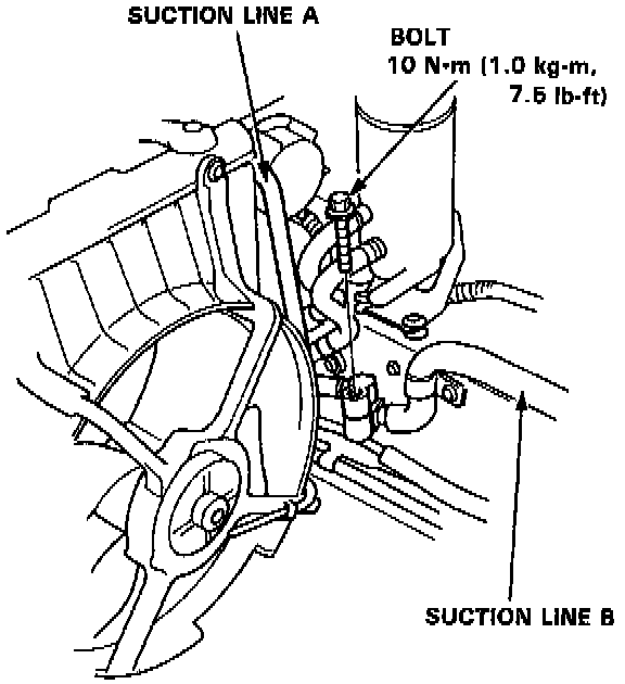 7. Remove the bolt holding suction line A and suction line B together.