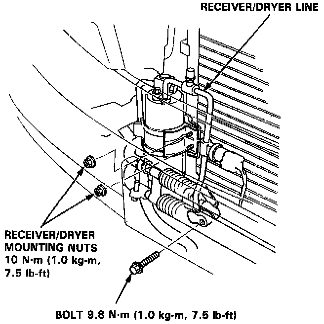 8. Remove the receiver/dryer mounting nuts. Remove the receiver/dryer pipe line bolt.