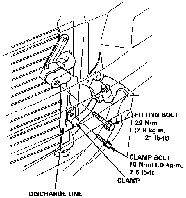 9. Remove the discharge line fitting bolt and the clamp bolt.