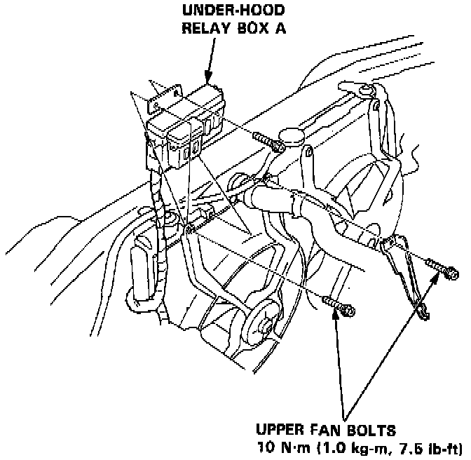 10. Remove the under-hood relay box A and upper condenser fan bolt as shown.
